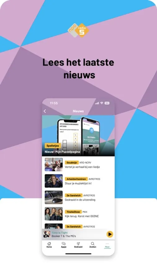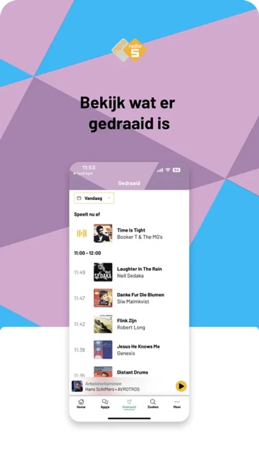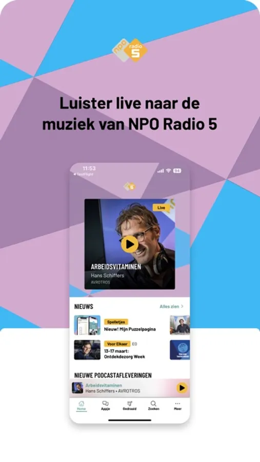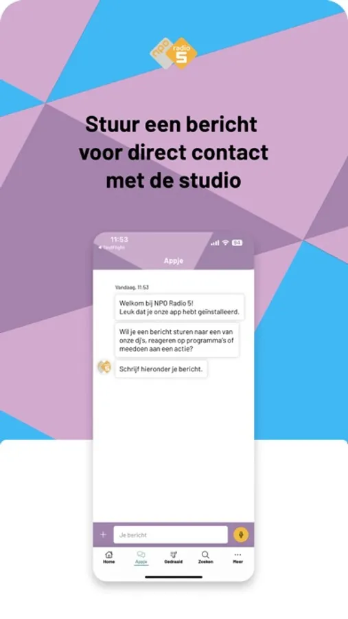 Via deze app luister je live naar NPO Radio 5 en luister je fragmenten of gemiste uitzendingen van je favoriete programma’s gemakkelijk terug. Ook kun je een gratis bericht sturen naar de studio via het app’je en podcasts beluisteren/downloaden.
