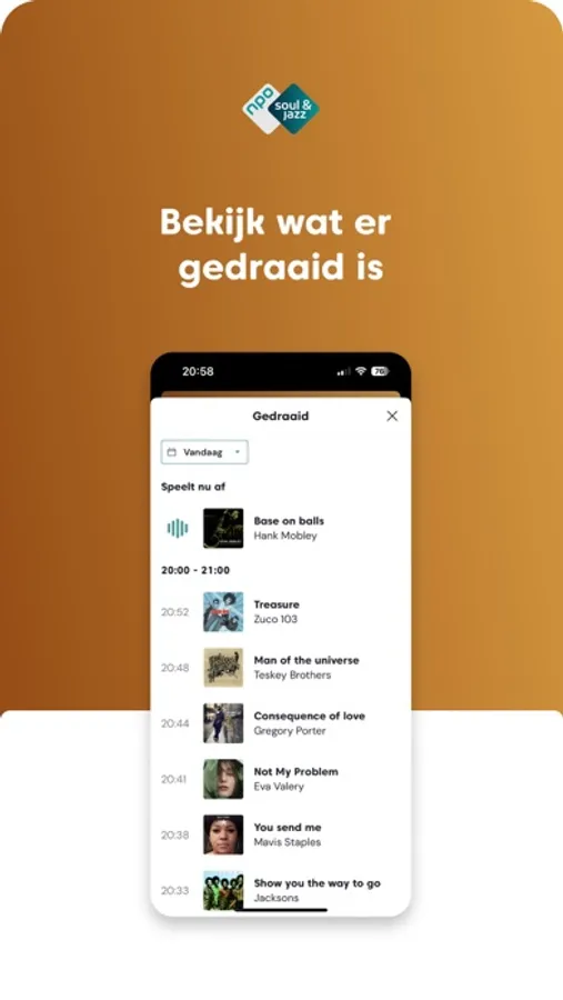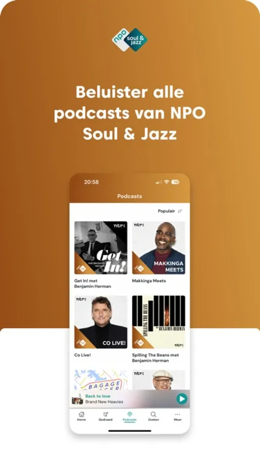 Dit is de officiële app van NPO Soul & Jazz. Bij ons hoor je de beste soul- en jazzmuziek, live-opnames van concerten en meer. Via deze app luister je programma’s on demand terug en check je info van je favoriete soul- en jazzartiesten.