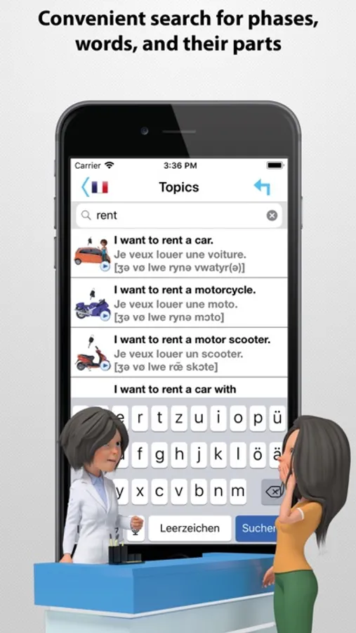 The integrated search function makes it even easier to find what you need. If, for example, you want to book a single room in a hotel, simply key in "single" and the phrase "I would like to book a single room" already appears on the screen.