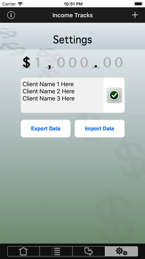 The "Settings" view allows you to define the format for your currency, add/edit a frequently used clients listing and export/import data.