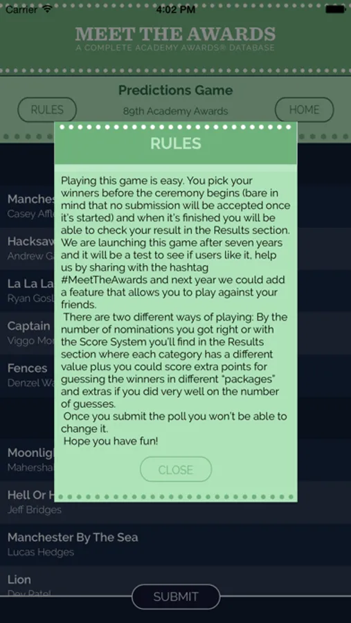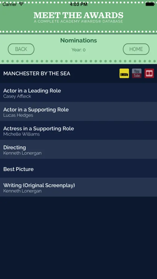 MEET THE AWARDS® allows you to keep a checklist on your iPhone, iPod Touch or iPad of which movies you have watched and which ones you haven't. Not only is it handy during award season but also afterwards as you can catch up on watching all the nominated movies you missed.