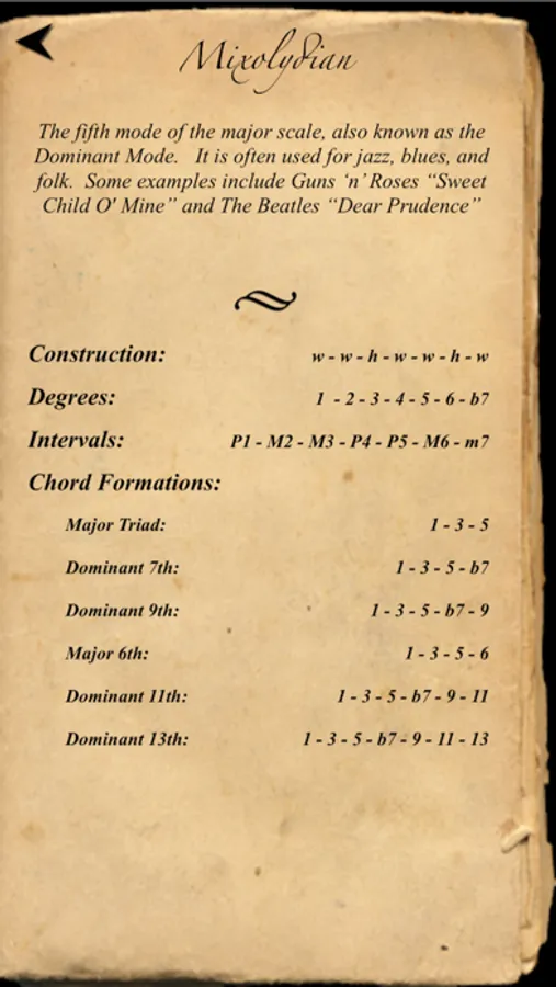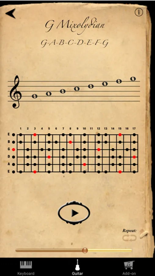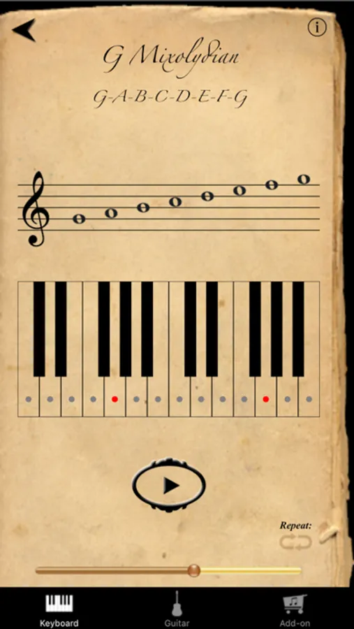 Select a root note and a scale to display the notes of the scale on the musical staff, and click “Play Scale” to listen. Select the Keyboard or Guitar tabs (or Violin and Bass after an in app purchase) to view fingering diagrams for the scale on those instruments, and press the info button to see more detail about constructing the scale.