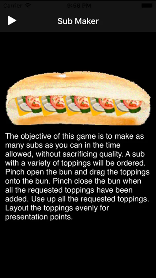 The objective of this game is to make as many subs as you can in the time allowed, without sacrificing quality. A sub with a variety of toppings will be ordered. Pinch open the bun and drag the toppings onto the bun. Pinch close the bun when all the requested toppings have been added. Use up all the requested toppings for full execution points. Spread the toppings evenly for full presentation points.