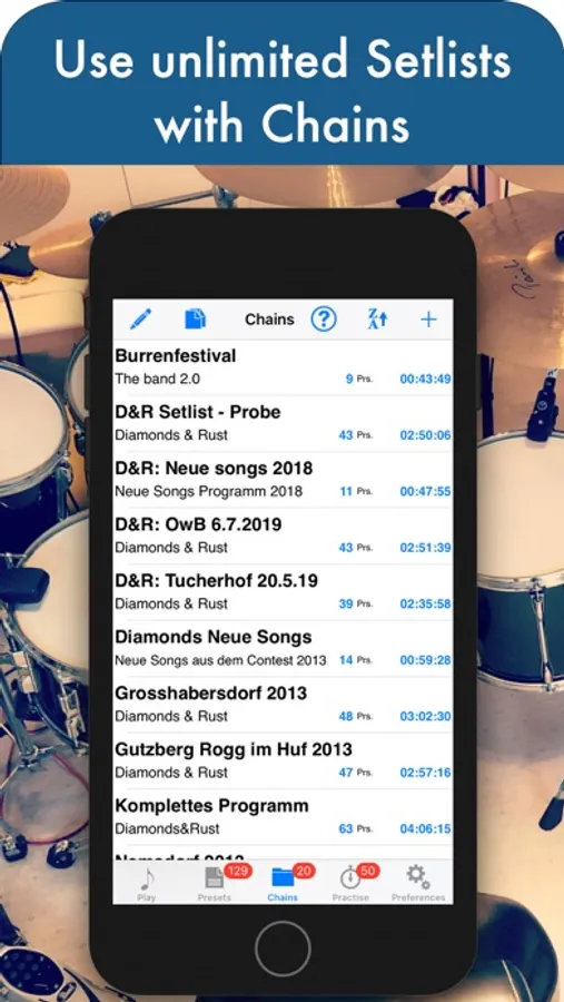 DrumSetlist Manager is an advanced setlist manager for musicians who have to play a setlist of songs in a row and possibly also in several bands / ensembles.