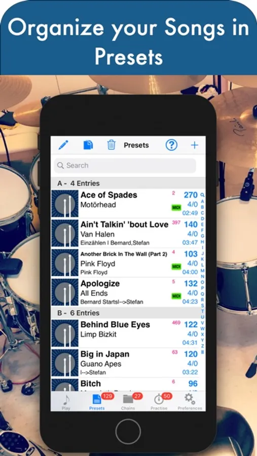 - Practise Manager with the 40 rudiments, Timing, Odd meter and Song practise capabillities
