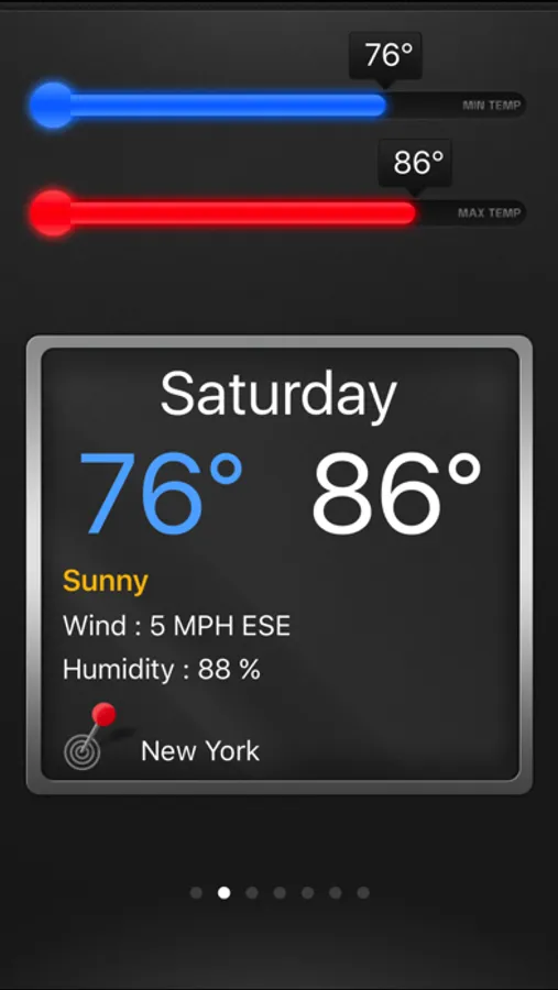 ◉ Local condition report, temperature, high & low, wind speed & direction, and humidity level.