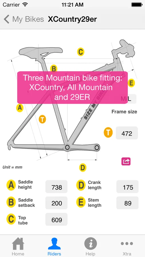 Three kinds of bikes are available for MTB: Xcountry, All Mountain or 29er. The frame size and the top-tube length should allow to choose the right bicycle size. The optimal saddle height, the crank length and the stem length are also computed.