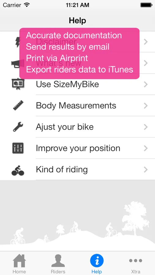 Share your bike measurement well fitted by SizeMyBike by email (PDF file). You can print wirelessly SizeMyBike results from your iPhone via AirPrint. You can also save the result on your computer via iTunes.