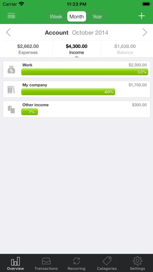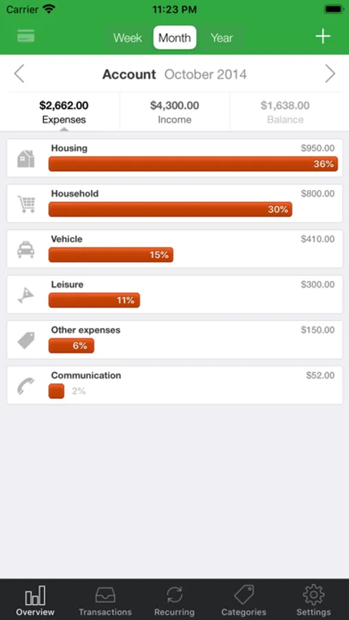 1. Week, Month and Year overview with stylish drill-down barcharts showing you how you spent your money and how much money you have left.