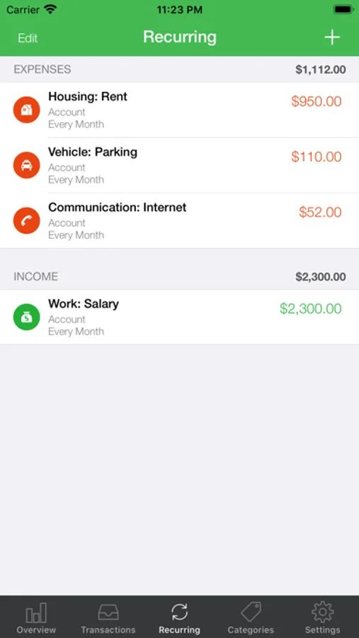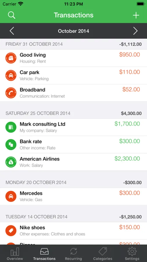 2. When you add your incomes and expenses they show up in a list per day. It is also possible to add recurring transactions to make it easier for you.