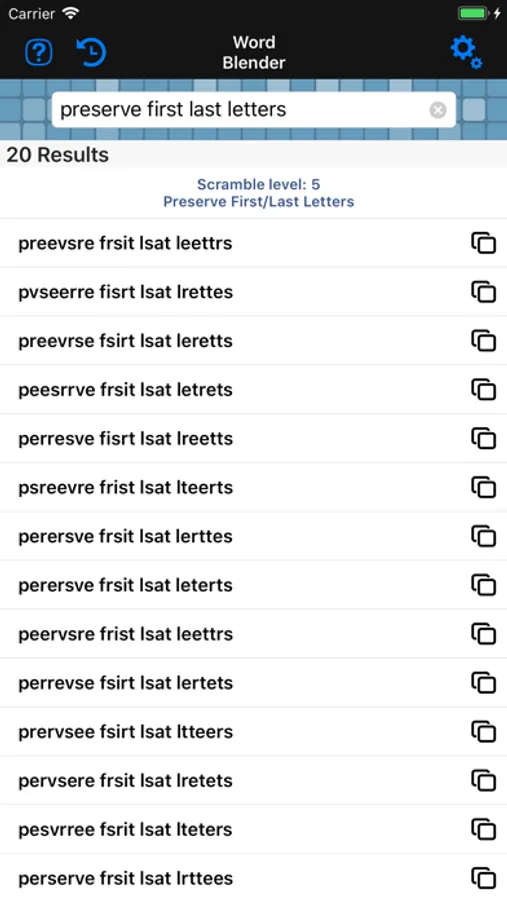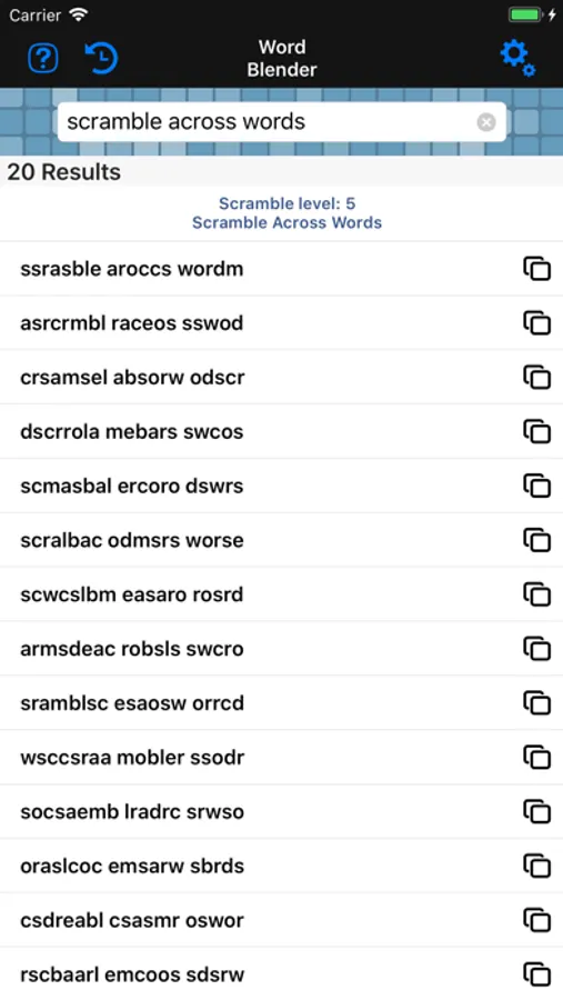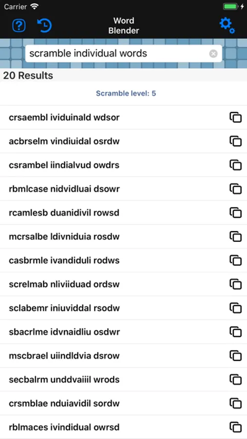 The Word Blender app scrambles words and phrases so you can make your own word scramble/jumble puzzle. Lots of scrambled results are generated so you can pick the one that looks best to you. Your choice from the results can then be quickly copied to the clipboard and then pasted into any other app.