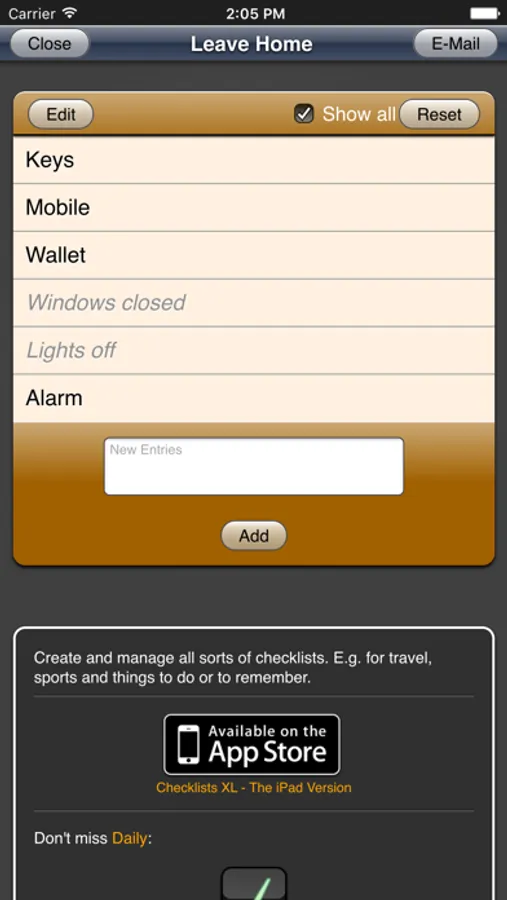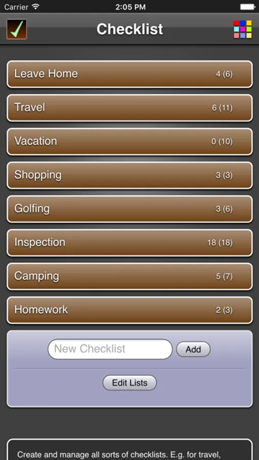 Create and manage all sorts of checklists. E.g. for travel, sports and things to do or to remember.