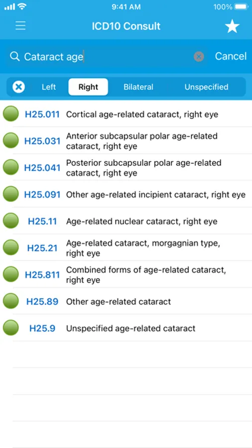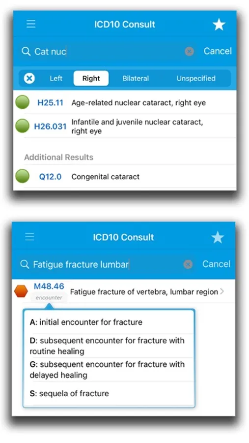• Deep code analysis allows easy handling of laterality, encounter, and staging codes, letting the app do the work of finding the perfect code