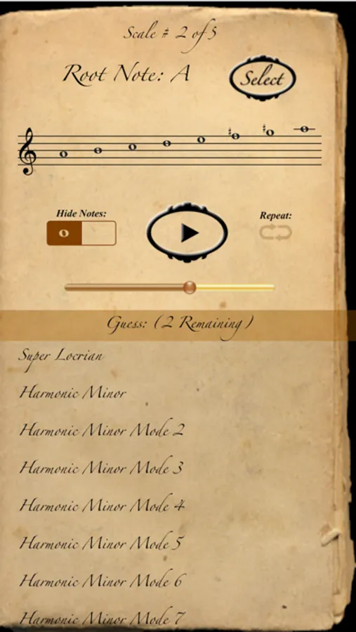 During the quiz, various scales and modes will be randomly shown on the musical staff. Choose whatever root note you like and listen to the scale, then it’s up to you to guess which scale or mode it is. For an even more difficult challenge, hide the notes and identify the scale by sound alone!