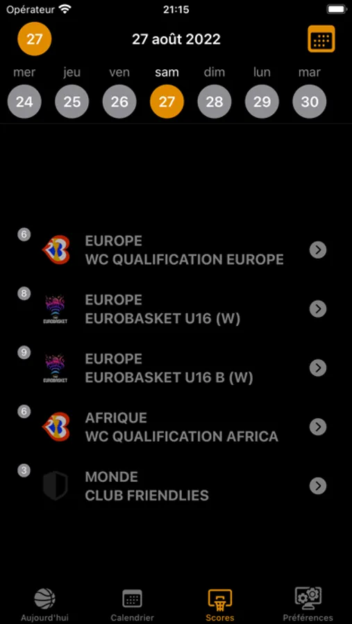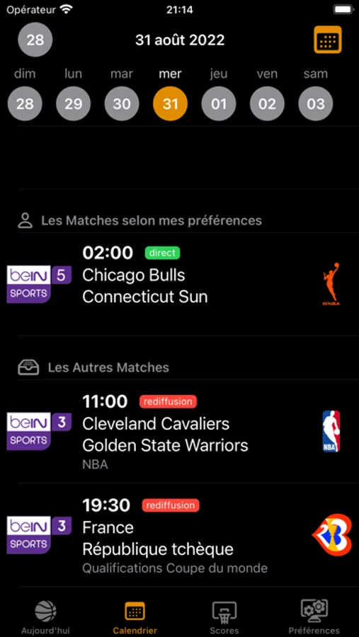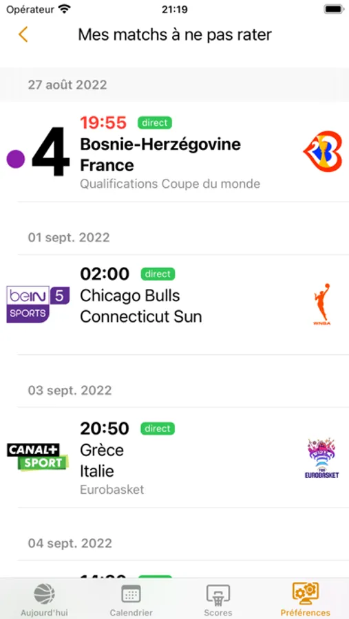 Dans cette section, vous avez aussi accès à votre liste des matchs que vous ne voulez pas manquer. Cette liste vous affiche les matchs que vous avez sélectionnés dans le programme. Cette liste est disponible hors ligne, donc votre programme reste accessible tout le temps.