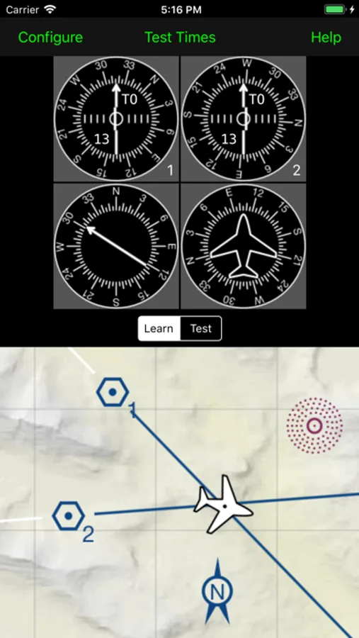 In Test mode the map is put into a random configuration and your task is to determine the aircraft location. Move and/or rotate the aircraft until it is in the the position indicated by the instruments. You can also set the OBS on the VORs.