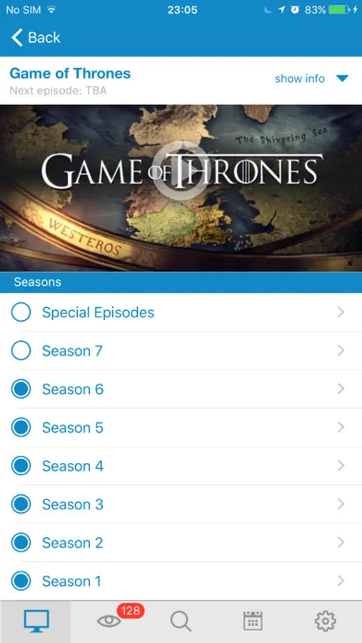 The shows appear in the main list. You can view show information, see all the seasons of a show, and read about episodes. Watch trailers and add notifications into your calendar.