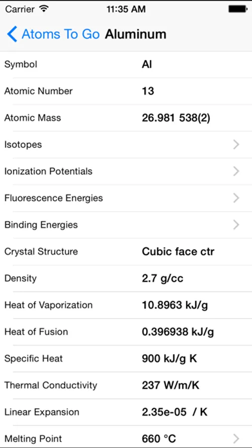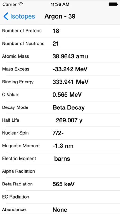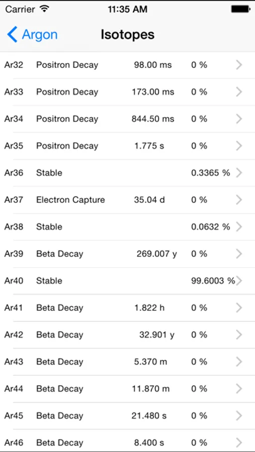 Atoms To Go is your go to source for chemical and nuclear data on the elements, much like a periodic table of the elements. In addition to the usual information found in such programs, it also contains a wealth of nuclear information on each isotope, including half life, decay mode, and daughter products.