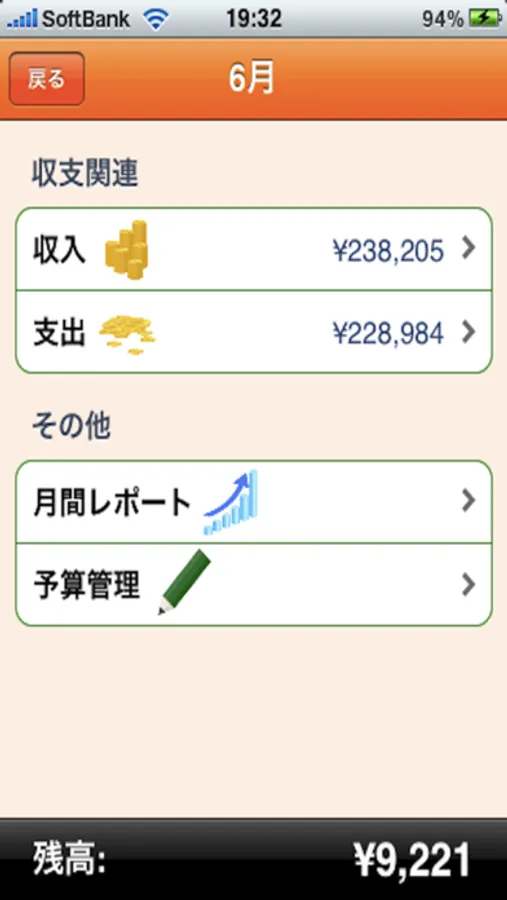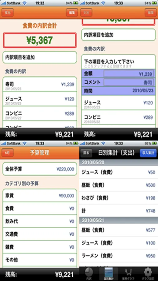 ●予算管理:全体の予算やカテゴリ別の予算を設定。予算は月間レポートのグラフに反映されます。