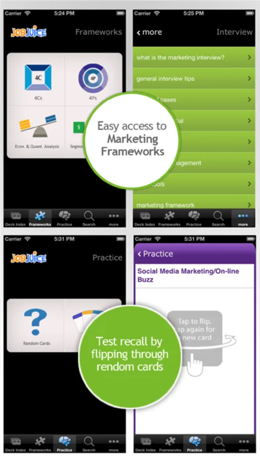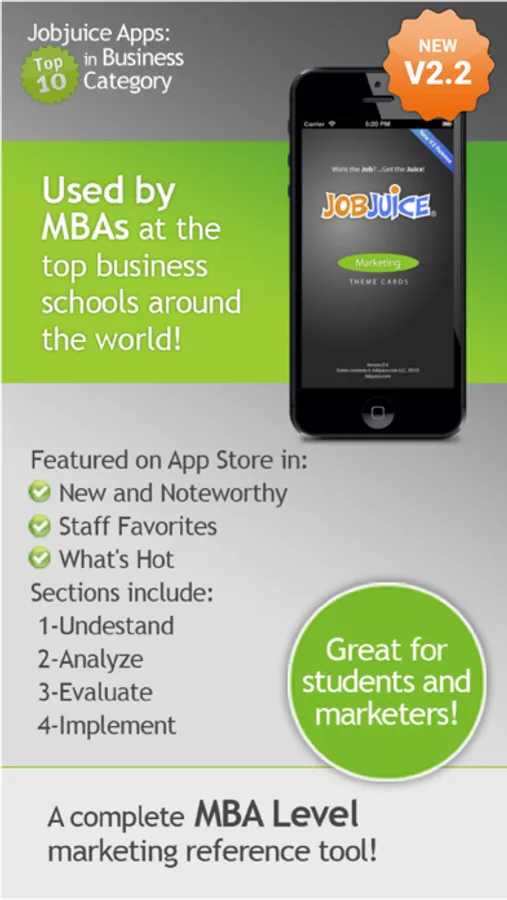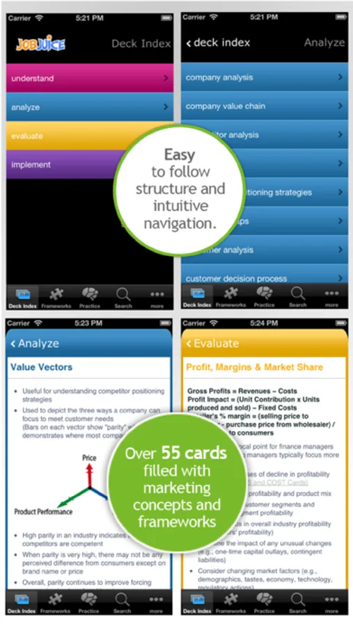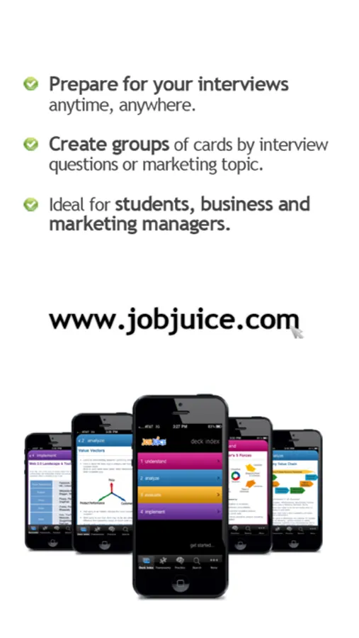 Access this reference tool anywhere, anytime! The Jobjuice Marketing App emphasizes practicality and efficiency as a reference and learning tool providing vast amounts of marketing strategy information at your fingertips!