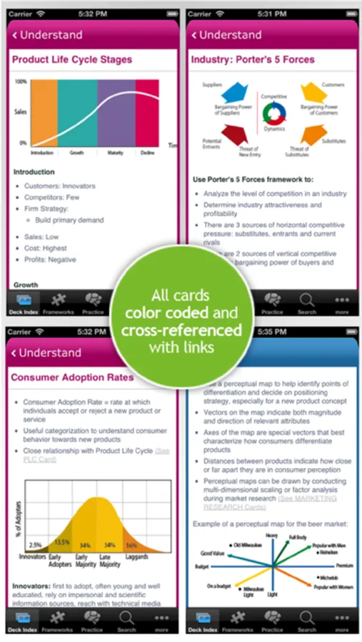 The App encourages dynamic preparation to develop creativity, structured thinking and solid business sense. There are over 50 themes (see contents below) that use cross-referencing to reinforce the links between strategic marketing and business concepts.