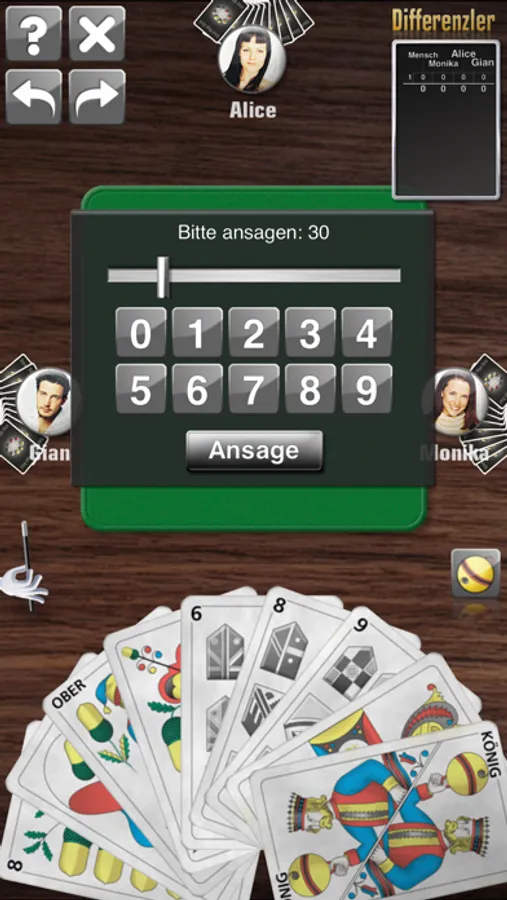 Der Differenzlerjass kann entweder mit verdeckter oder mit offener Ansage gespielt werden - je nach Einstellungen auf 4, 6, 8, 10 oder 12 Runden.