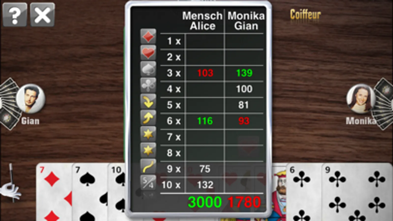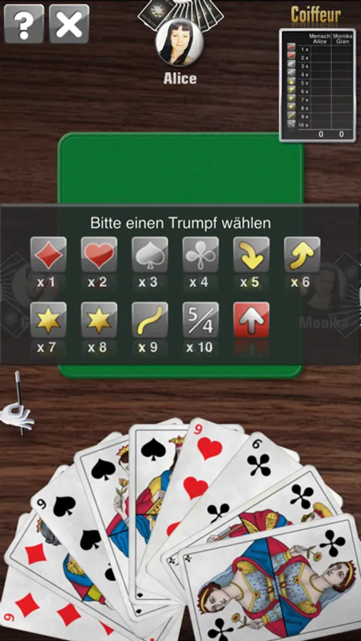 Der beliebte Coiffeurjass unterstützt die Varianten Slalom, Guschti 5/4, Undenufe, Obenabe und die vier Trumpffarben. Gespielt wird entweder der Coiffeur auf 8 Runden ohne Slalom und Guschti oder auf 10 Runden mit allen Varianten.