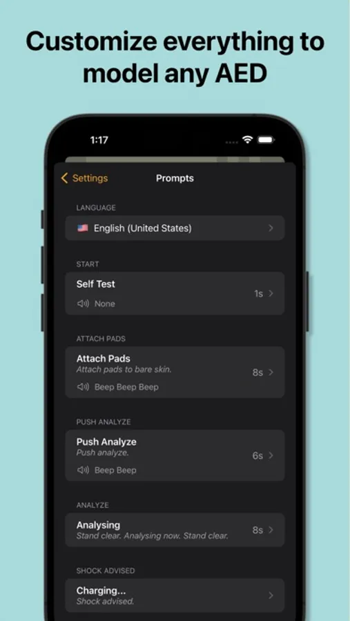 - All prompts, messages, timing, and voices are customizable. You can change any message or voice prompt to match any AED.