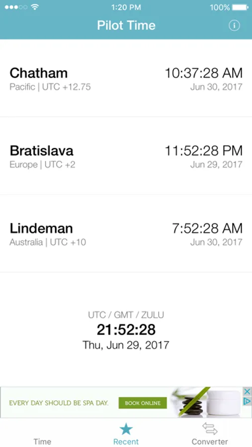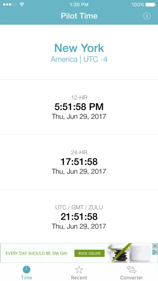 Developed by pilots who can never remember the current UTC (GMT/Zulu) time conversion, Pilot Time instantly gives you the current time and date for your zone, plus UTC time.