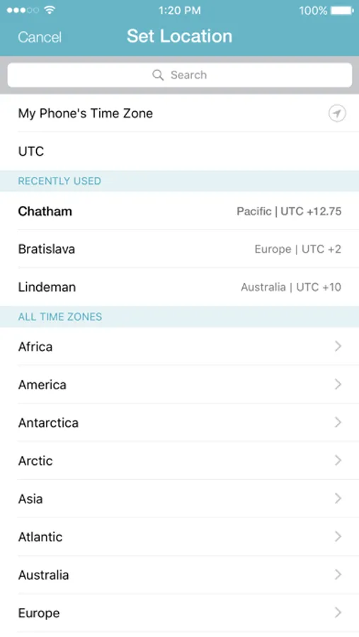 And selecting time zones is easy: first find the continent, then the city you want. No more mental calculations.