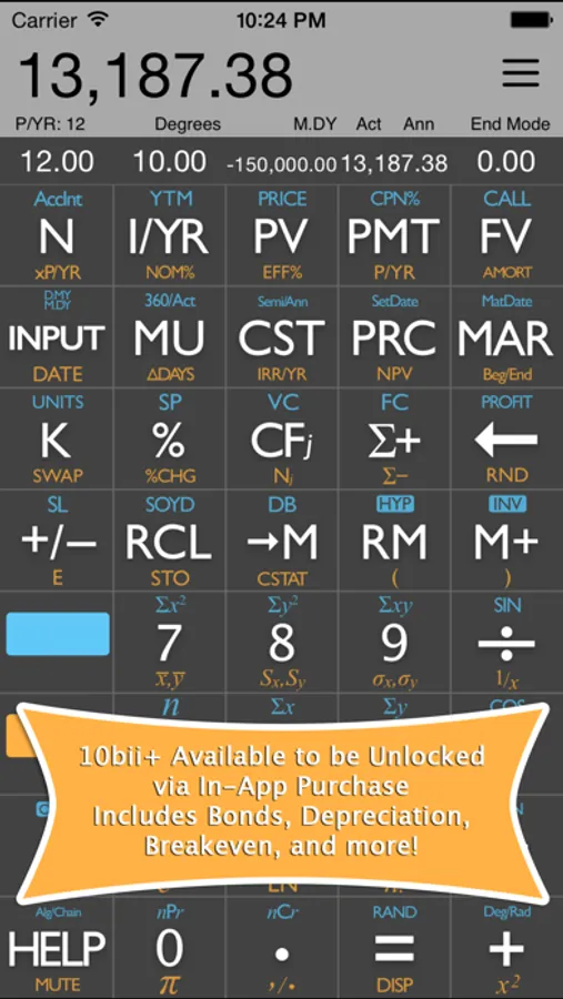 In-App Purchase: 10bii+ Features (Bonds, Breakeven, Depreciation, Trig, Probabilities) available!