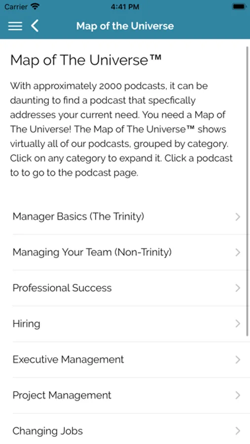 Tap the Map of the Universe menu option to easily browse through our 1000 podcast episodes (and counting) organized by topic. You can also use the Podcast Search functionality to target specific keywords or find the niche subjects you’re looking for.