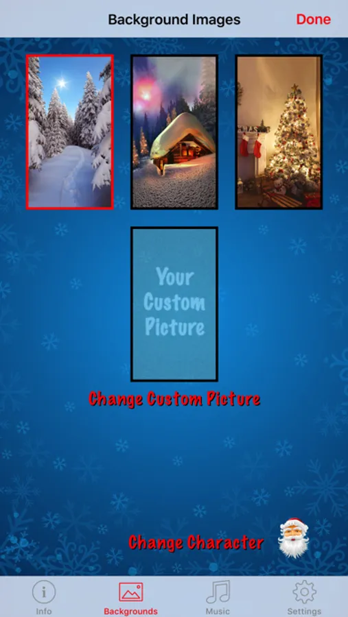 • Select any background image from your device's photo album or use one of the 3 included holiday images.