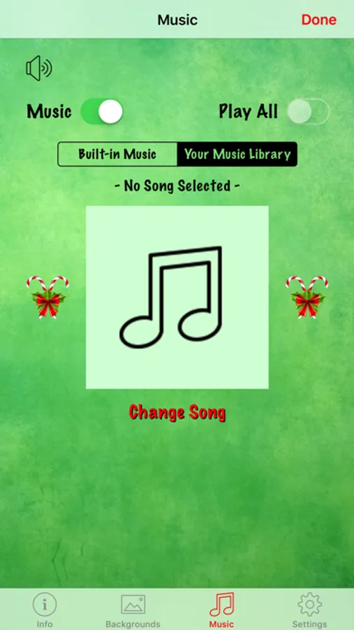 • Select one of 8 holiday background musical soundtracks. Select one or automatically play all the songs in a repeating sequence. Select Airplay to play the music to your Apple TV.