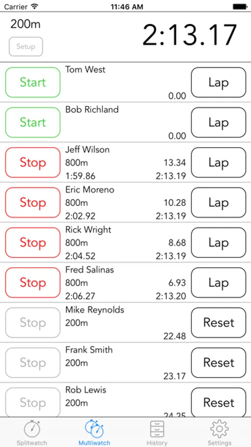 - Automatically calculates the split breakdown as you are timing. For example, if set for 200m intervals would yield each 200m, 400m, 800m, and 1600m (or 1000m if in Kilo split mode) throughout the race.