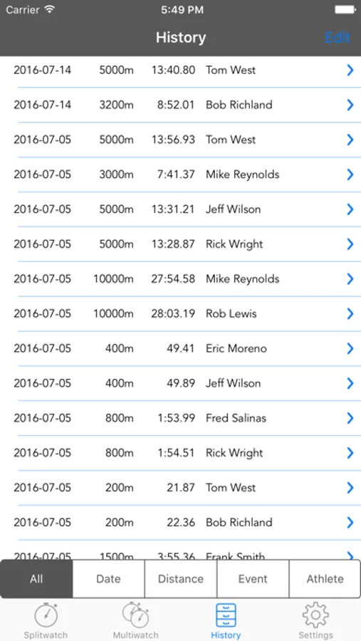 - Quickly recall any recorded timing event in the History view, including athlete name, event name, race start date and time, final time, lap times, split breakdown, closing splits, and split summary info (Min, Max, and Avg lap).