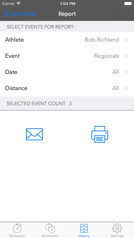 - Email or AirPrint (New!) a Split Report with all the event info and split breakdown right from Splitwatch. Generate reports for a single race or combine multiple races in one report and then email or print to any AirPrint compatible printer.