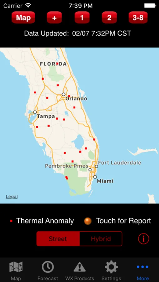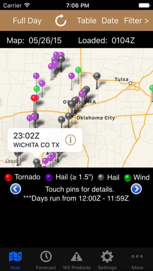 - Map of storm events with color coded pins. Timeframes are 3-hr, full day, or archival (back to 29 Feb 2004). Touch any pin for access to details. iPod Touch or WiFi-only iPad users, data from your last view is cached for off-line use.