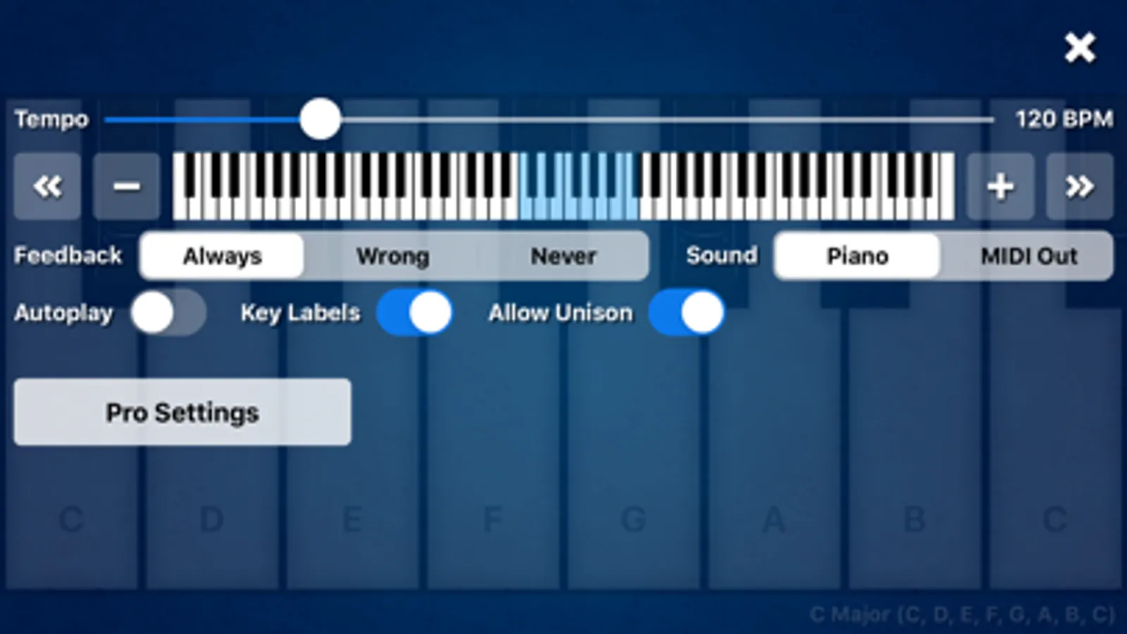 Autoplay – Turn on to always play the next interval immediately. Turn off if you want to play the keyboard freely between intervals.