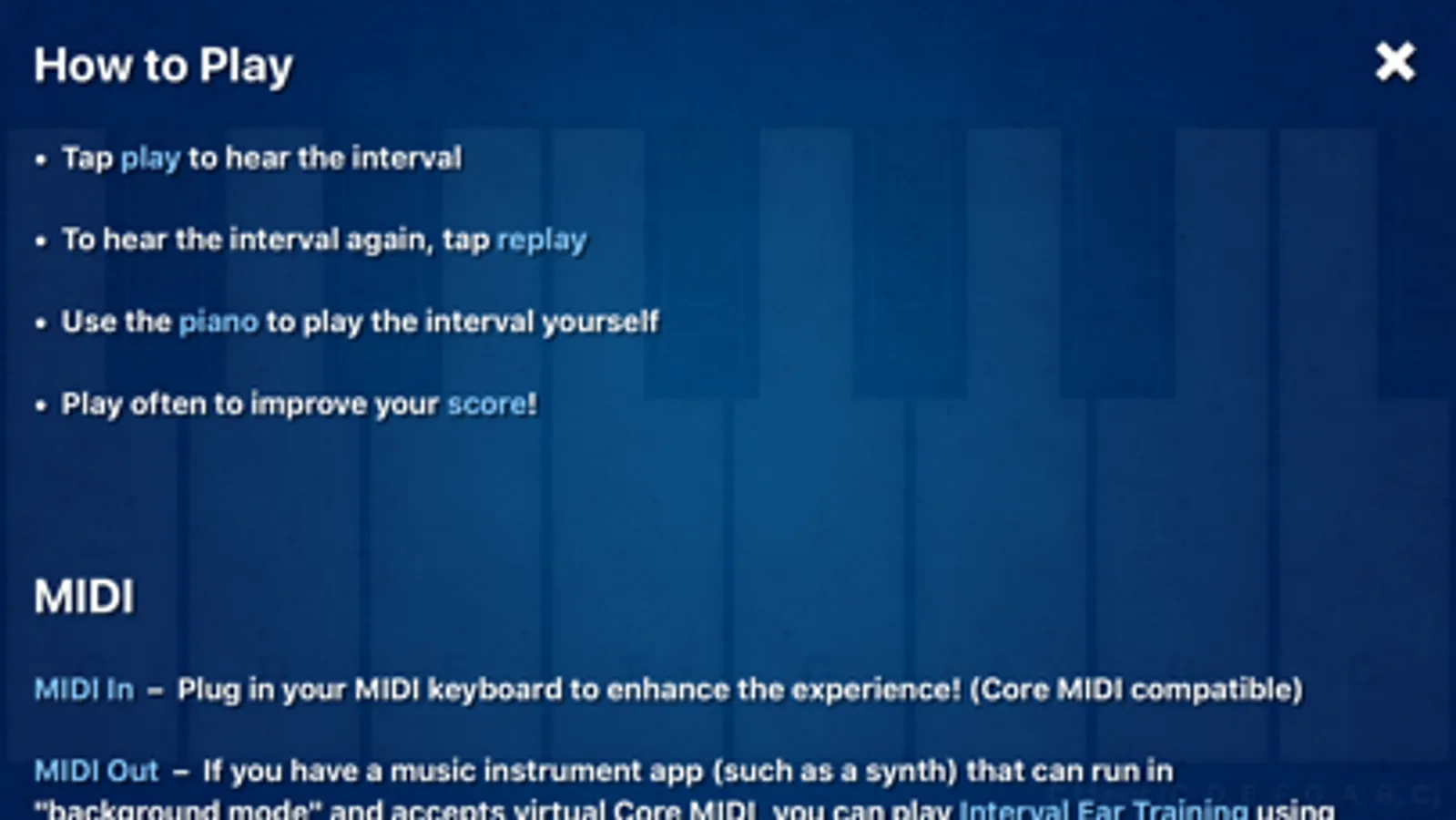 MIDI Out – If you have a music instrument app (such as a synth) that can run in "background mode" and accepts virtual Core MIDI, you can play Interval Ear Training using the sounds of that app.