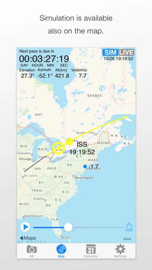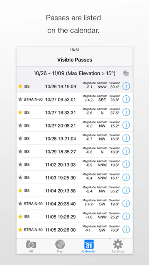 The "Calendar" tab displays events like upcoming satellite passes and rocket launches within the next two weeks. You can choose a pass from the list and simulate it in AR.