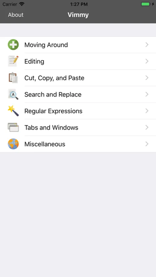 Vimmy is a Vi/Vim quick reference tool and "cheat sheet" for users of the popular editor. It is not a complete guide to every possible Vi/Vim command, but rather an easy to use compilation of the most commonly used functions. As you've probably seen, many reference books have been written for this editor. Instead of trying to cram hundreds of pages of information into a cluttered and messy interface, I designed Vimmy to be a quick and easy to use companion for the average Vi/Vim user. The colorful interface is intuitive and simple, and is divided into easy to navigate categories like "Moving Around", "Entering Text", "Search and Replace", etc. If you see something you'd like added, email me and I'd be happy to accommodate your request.