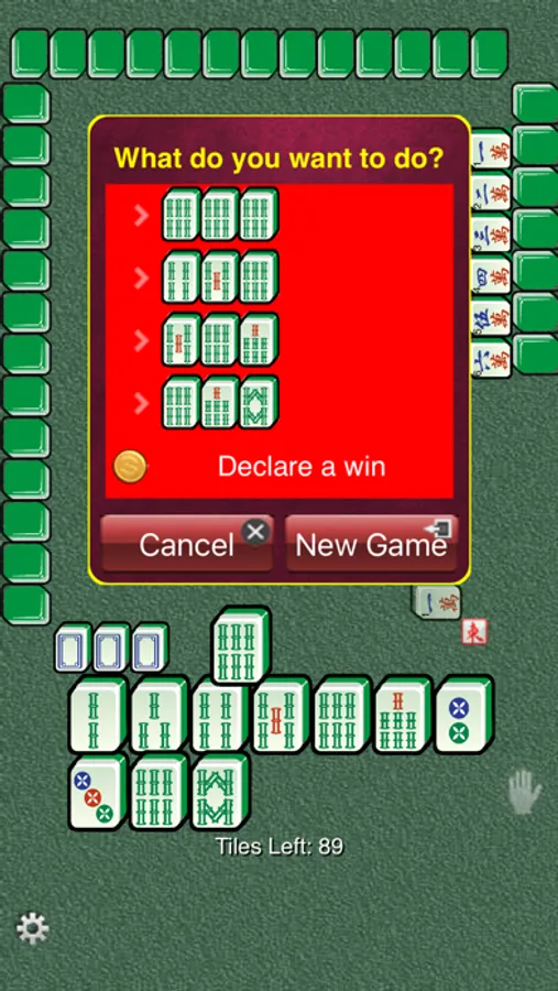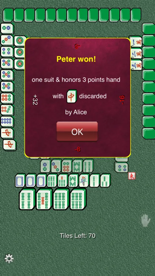 Each player is dealt 13 tiles in a hand. The players take turns to draw a tile and discard one. The goal is to make 4 sets and 1 pair. Declare a win by tapping on a received tile or tapping/dragging on discarded tile that completes the hand of 14 tiles. The default mode will auto prompt you when a set or a winning hand can be formed with a tile drawn or discarded. Hands formed must be of some minimum point value (0-3) in order to win the round. A zero base point would allow chicken hand. The default is 0 base point, but can be customized.