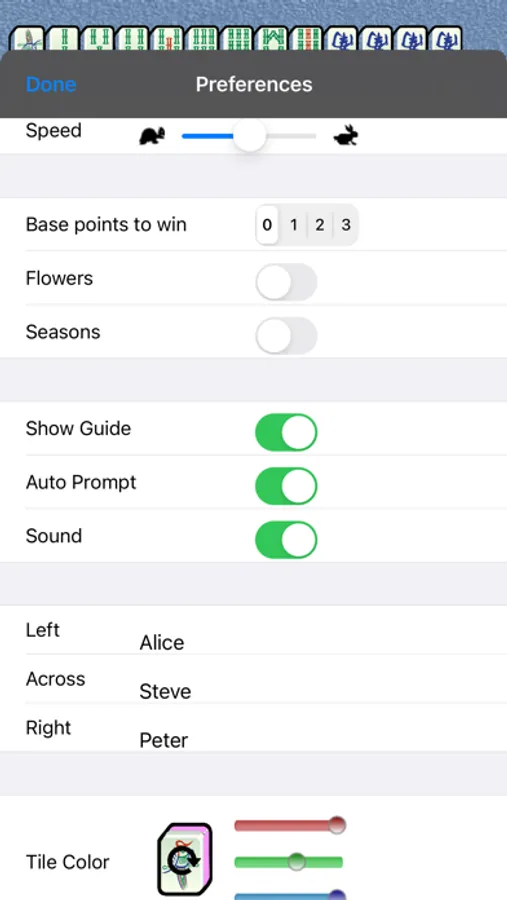 You can adjust the game speed and sound. You can also control that hands be of some minimum point value (0-3) in order to win the round. A zero base point would allow chicken hand. You can choose to play flower and season tiles.