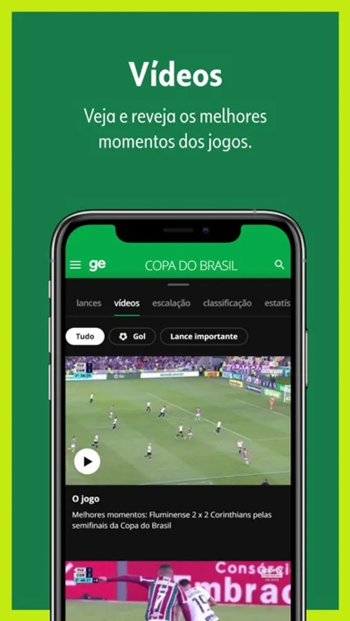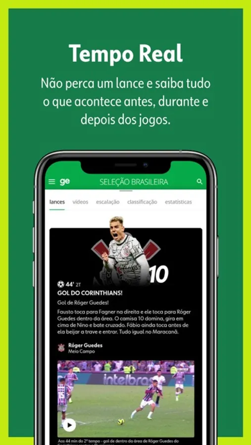 Antes das partidas começarem, no app do ge, você encontra todas as informações importantes, como escalação e classificação dos campeonatos. E, durante os jogos, você não perde nenhuma jogada! Siga todos os lances em tempo real com as melhores estatísticas e jogadas no campinho, além de receber notificações de gols e ainda poder compartilhar o card na sua rede social de preferência. Isso mesmo, Agora dá pra zoar os amigos e repostar toda vez que seu time fizer um gol.