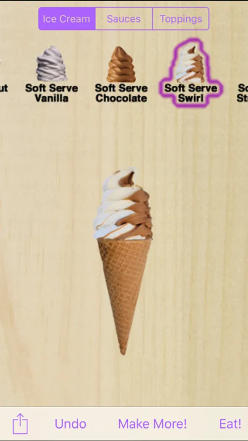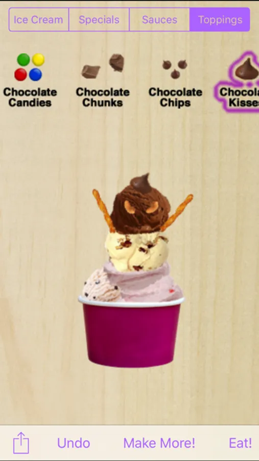 After you have built the world's greatest sundae, dig in! Take virtual bites or even lick the ice cream off a cone just by swiping your finger. But before you eat it all, save a photo of your ice cream to your photos album or email it to your friends.