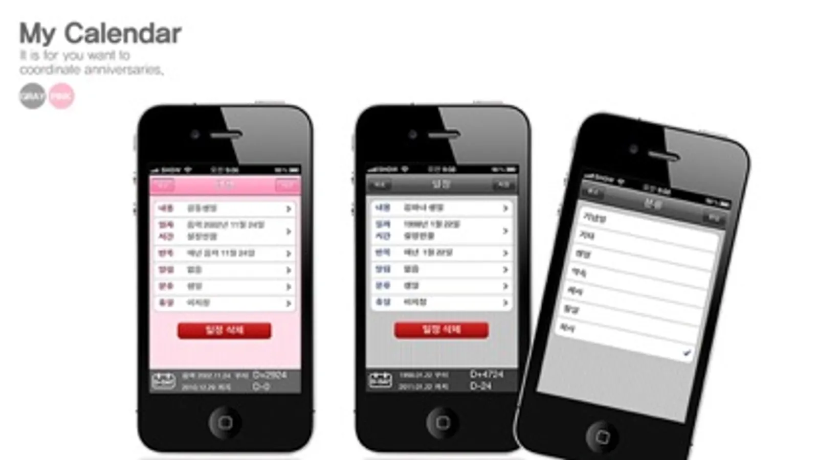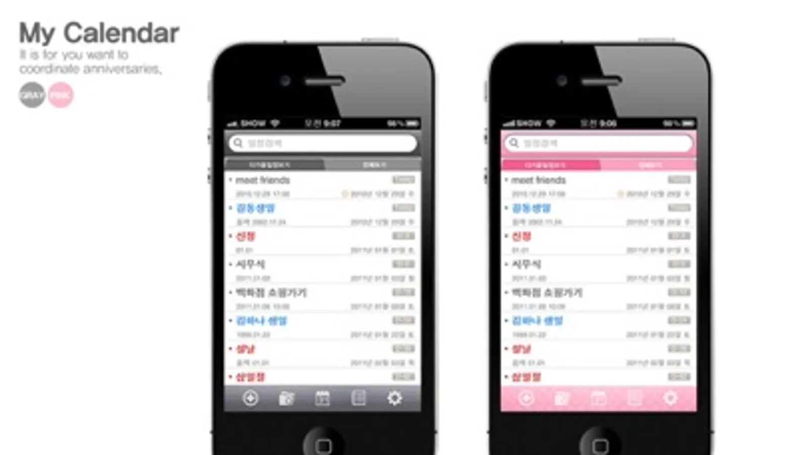 마이캘린더는 나만의 일정관리 프로그램입니다. 음력(윤달포함)을 지원하고 다양한 반복주기를 제공합니다. 또한 iOS4.0 이후에서는 알림 기능이 지원되니 iOS 버전을 확인하여 유용하게 사용하세요. 일정 입력시 양음력을 확인하시고 반복, 알림 등의 기능을 유용하게 사용하세요. 일정이 추가된 날은 달력에서 일정이 표시되며 목록을 선택하시면 일정 목록이 모두 뜹니다. 지나간 일정은 전체보기에서 확인 가능하며 목록에서 일정의 초성검색을 지원하고, 현재 날짜를 기준으로 D-day를 함께 보여줍니다.