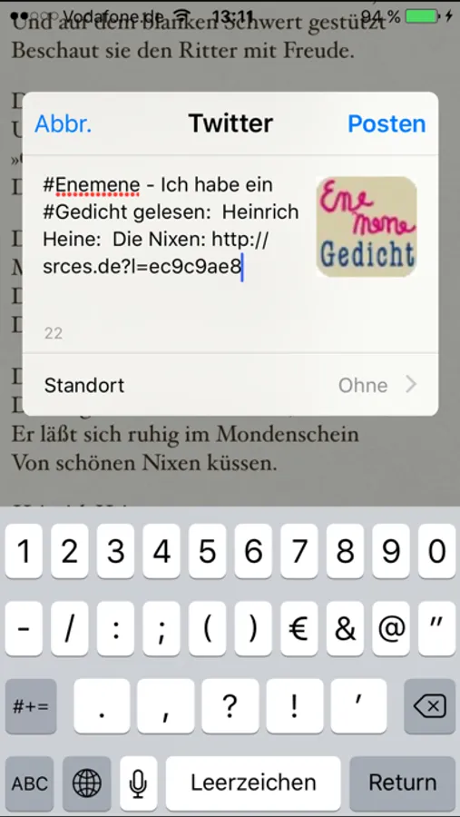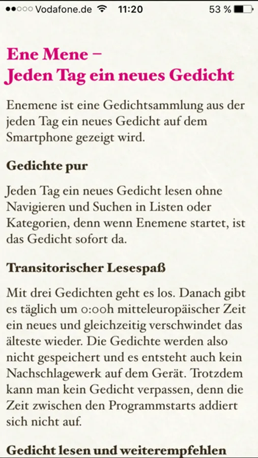 Enemene ist eine Gedichtsammlung aus der jeden Tag ein neues Gedicht auf deinem iPhone oder iPod gezeigt wird. Mit drei Gedichten geht es beim ersten Programmstart los. Danach holt sich die App täglich ein neues Gedicht von unserem Gedicht-Server und das älteste verschwindet wieder. Es sind immer drei Gedichte sichtbar, das aktuelle, das gestrige und das von vorgestern.