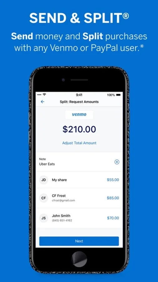 Send & Split® enhances the way you send money and split purchases with other Venmo and PayPal users, all in the American Express app.* Now you can pay friends with more flexibility and without the standard Venmo or PayPal credit card fee§. You can also seamlessly split your Amex purchases with others and get paid back directly to your Card as a statement credit. Best Part? You’ll be the one to earn the rewards for the purchase you split. Enrollment Requirement. Terms Apply. § PayPal may charge a fee when sending to non-US recipients.