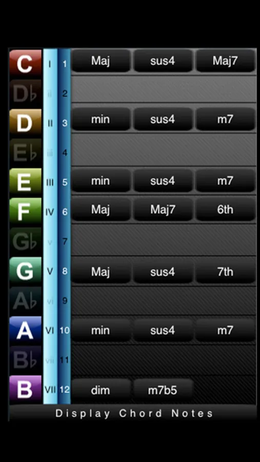 Flip the phone from landscape to portrait to view the Chords screen - this larger view makes it easy to experiment with scale and chord sounds.